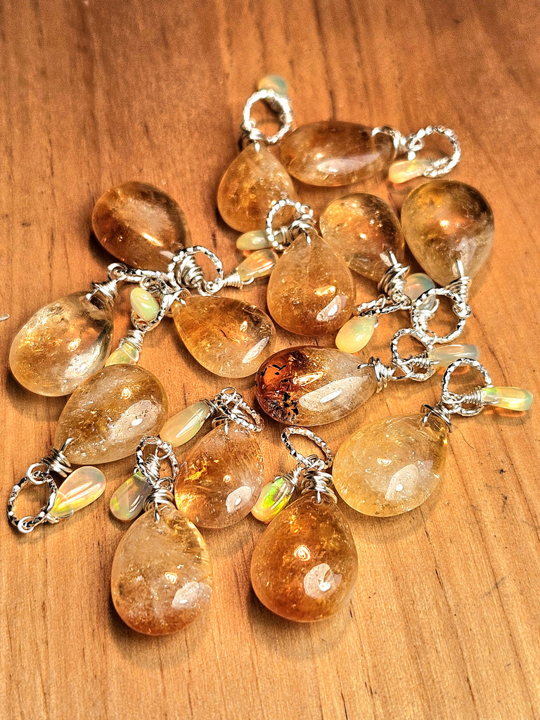 This limited edition floater pendant features a 15–17mm (7–8 carat) smooth Citrine briolette accompanied by an 8mm Ethiopian Opal. Both drops dangle from a textured 7mm sterling silver ring. Each Opal displays vibrant fire and flash, while the Citrine glows with a rich golden hue. The pendant can be attached to your favorite sterling silver chain or added to your favorite KF strung necklace featuring small gemstones.
