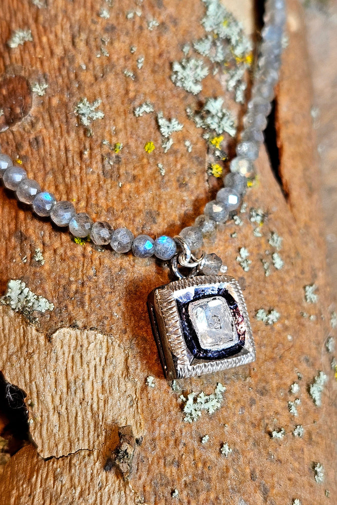 This unique, limited edition necklace features a 10mm square sterling silver pendant inset with an organic shaped Diamond center. The drop hangs from 16" of strung 3mm faceted Labradorite rondels. The necklace is finished with a 9mm oval lobster clasp and 2" sterling silver extender chain.