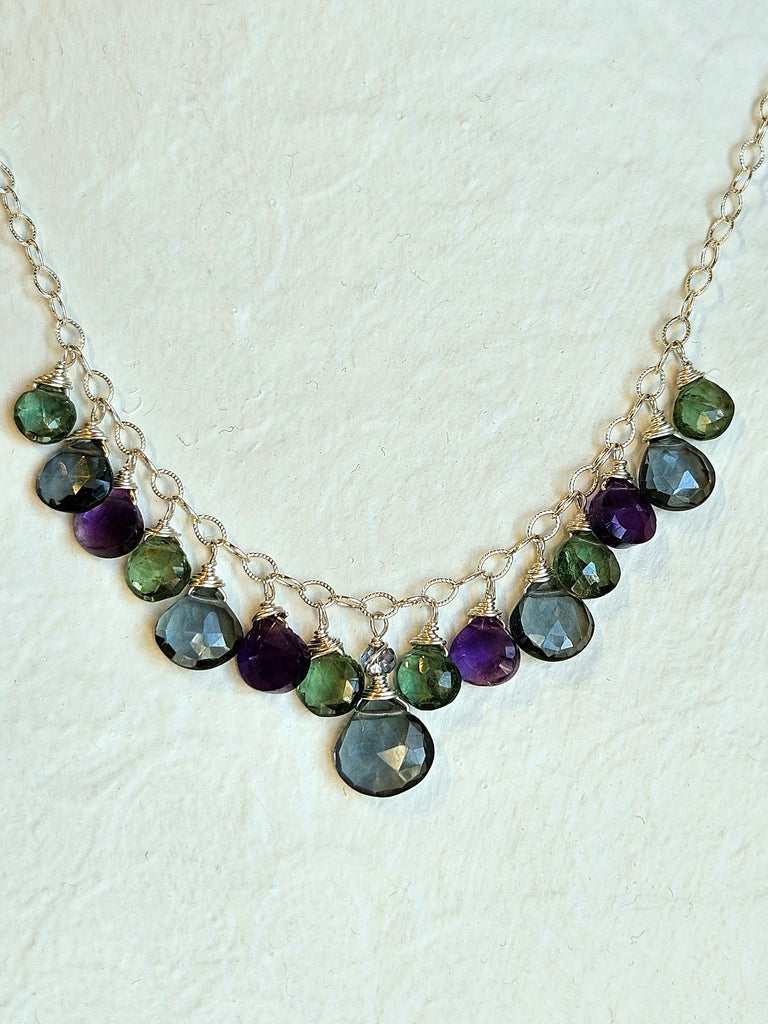 This limited edition necklace features a beautiful cascade of faceted briolettes in Slate Quartz, Green Apatite, Amethyst, and Serpentine. The center stone is a bold 10mm drop, flanked by slightly smaller stones approximately 7mm in size, creating a graceful gradation in tone and shape. The sterling silver chain is 16 inches long, finished with a 9mm oval lobster clasp and a 2-inch extender for adjustable length.