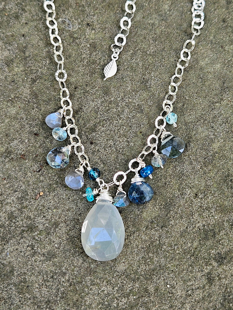 This unique necklace features a luminous 20mm faceted Silver Moonstone briolette as the centerpiece, accented with a cascade of mixed rondels and briolettes of Apatite, Topaz, Slate Blue Quartz, Indigo Kyanite, and Labradorite. The gemstones are artfully attached along an 18" sterling silver chain, finished with a 9mm oval lobster clasp and 2" extender chain.