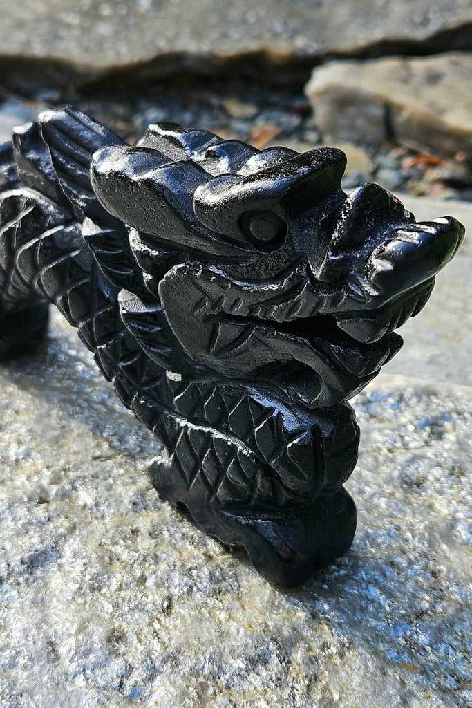 This intricately carved Black Obsidian Dragon is a commanding, three-dimensional piece with remarkable depth and presence. Measuring approximately 8" long and standing about 3 1/2" tall, the carving weighs roughly three-quarters of a pound. Every scale, curve, and contour is thoughtfully shaped, giving the dragon a sense of motion, vigilance, and ancient authority.