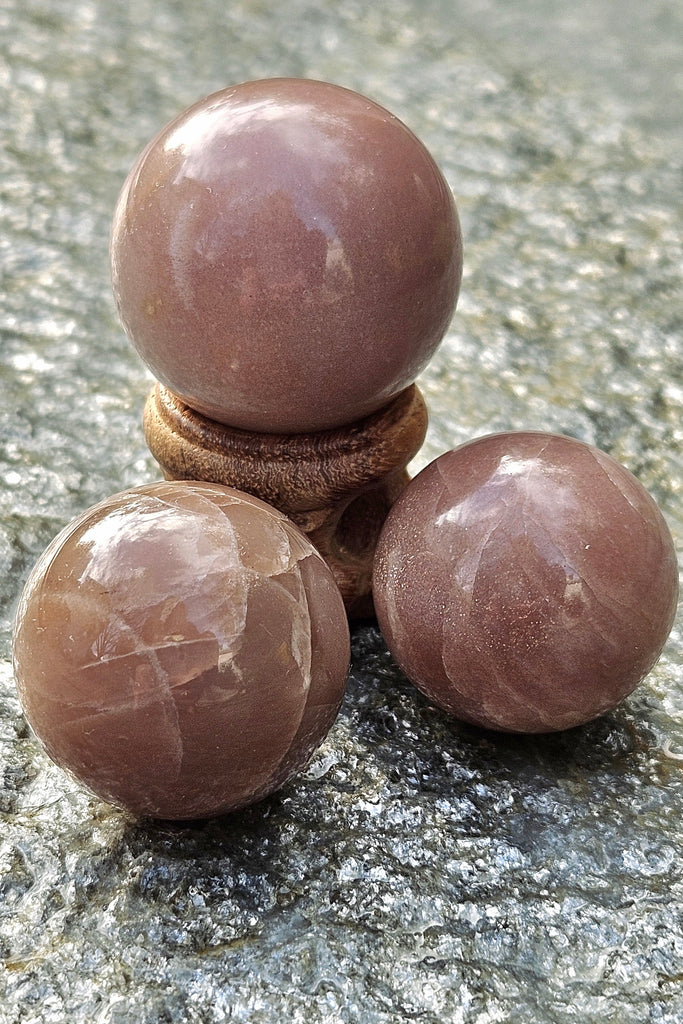 These top-grade Moonstone spheres are rich and luminous, with beautiful chocolately and peachy tones that seem to glow from within. Each sphere is polished to highlight Moonstone’s natural sheen and depth, creating a soft radiance that shifts gently with the light. They are available in two sizes — 30mm and 35mm — allowing you to choose the presence that feels just right for your space or practice. You can also catch shimmers of Sunstone within each sphere.