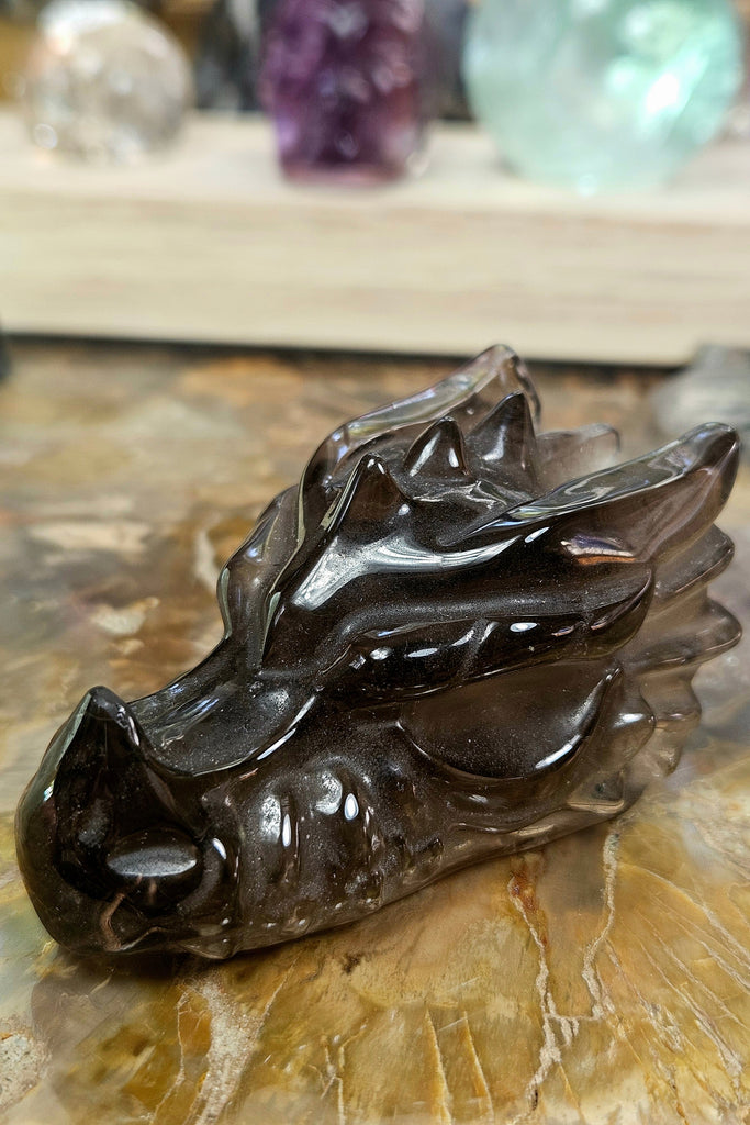 Hand-carved Smoky Quartz dragon head, each piece showcasing natural smoky hues ranging from translucent light brown to deep earthy gray. Sizes vary slightly, as each carving is one-of-a-kind, but the approximate size is 2 3/4" long and 1 1/2" tall, with intricate detail highlighting the dragon’s protective spirit.