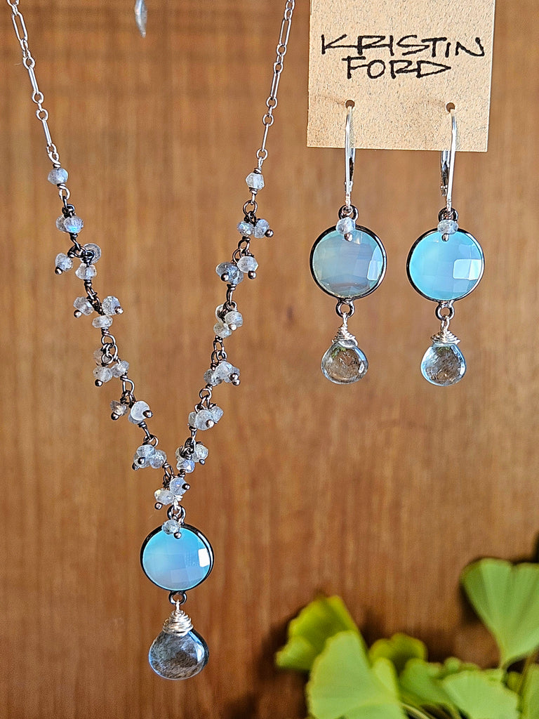 Black Aquamarine offers deep calm, resilience, and grounding energy. Chalcedony is known for harmony, communication, and emotional balance. Together, they create a piece that steadies the spirit while opening the heart to peaceful self-expression.