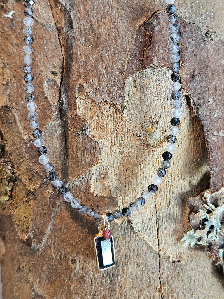 Striking yet versatile, this necklace captures the elegance of Black Onyx framed by the natural texture of Black Tourmalinated Quartz. The Garnet detail brings just a hint of color, adding warmth to the bold black palette. Sophisticated enough for evening yet perfectly grounding for daily wear, this piece makes a powerful statement on its own or layered with other favorites.