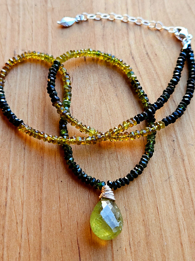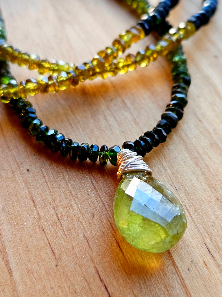 This limited edition necklace features a 16mm (more than 10 carat) Grossular Garnet briolette dangling from a 16" pattern of 3mm Green Tourmaline rondels. The natural variation in Tourmaline’s color creates a dynamic flow from soft moss to deep forest green. Finished with an 11mm sterling silver oval lobster clasp and 2" extender chain.