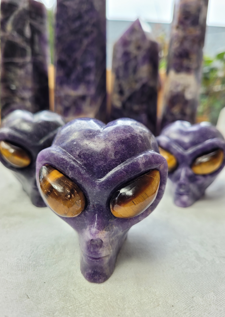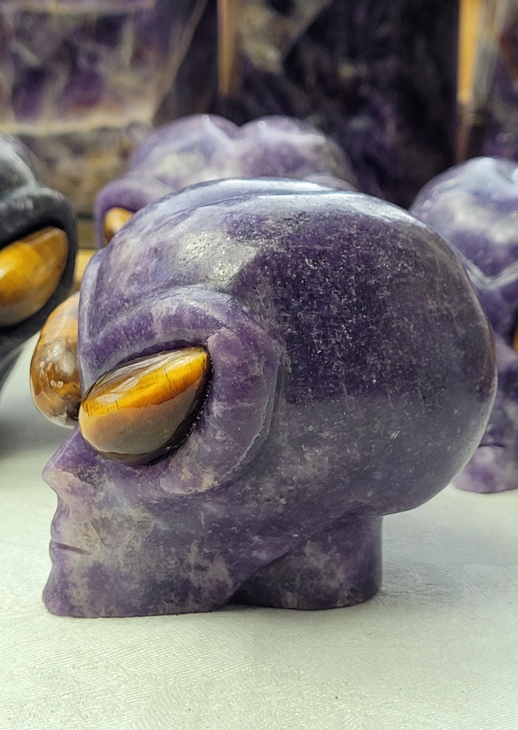 These custom-created Lepidolite Star Being skulls are truly otherworldly. Each piece weighs approximately 1 pound and is meticulously carved with striking Tiger’s Eye eyes that add depth, presence, and intensity. Measuring about 2.75" tall, 3" long, and 2.5" wide, every skull is a one-of-a-kind being with remarkable craftsmanship and dimensional detail. When you look into the eyes, there is an undeniable sense of connection and awareness. Photos are provided from multiple angles to show the unique shape and artistry of each piece.