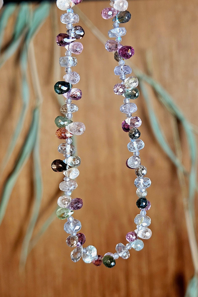 This sparkling, one of a kind bracelet features a 7" pattern of 5mm Sapphire teardrops and rondels in soft shades of silver, light blue, pink, green and lavender with 1.8mm faceted Labradorite rondels. The bracelet is finished with an 11mm sterling silver oval lobster clasp and a 2" extender chain.